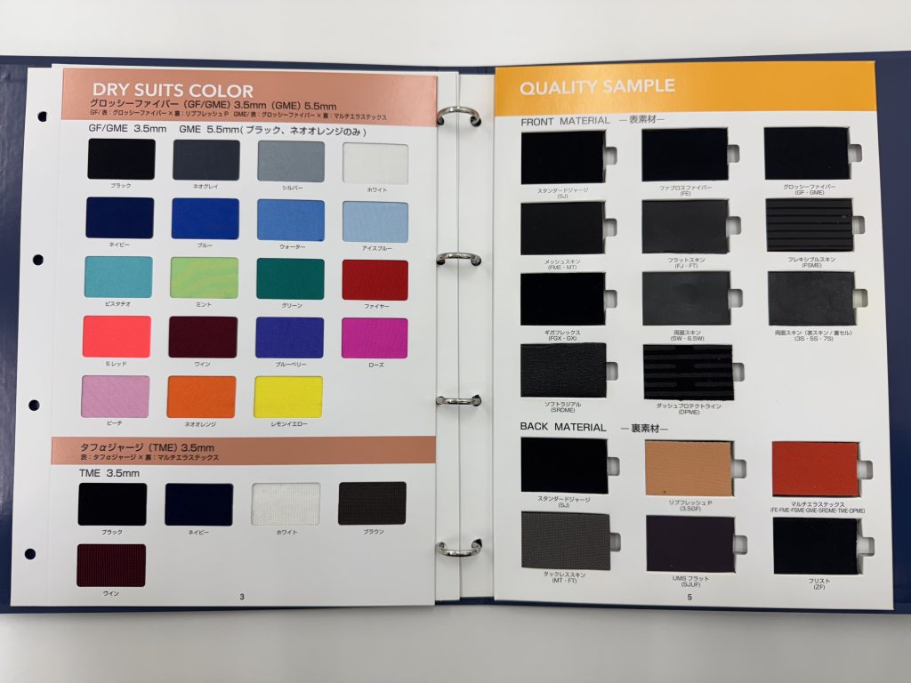 ワールドダイブ社より2025年カタログとカラー・生地サンプルとともに、各スーツの特徴を丁寧にレクチャーいただきました