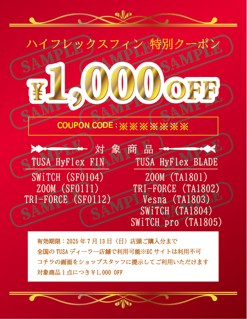 タバタ社TUSAよりハイフレックスフィンに関する期間限定のお得なクーポンのご案内です