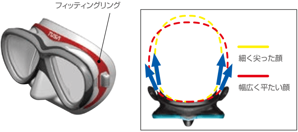 フィット感を高める工夫として、顔に触れるシール部がスイングする構造を採用し、顔の角度や骨格の違いに柔軟に対応。