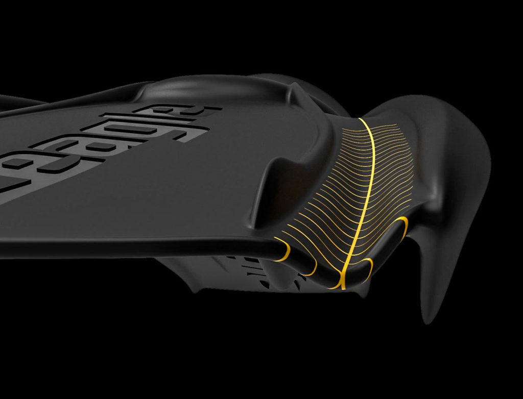 裏面の四ヵ所と表面の二ヵ所に配置されたストレーキが乱流を大幅に抑制するため、上下方向のキック時に驚異的なパワーを発揮します。