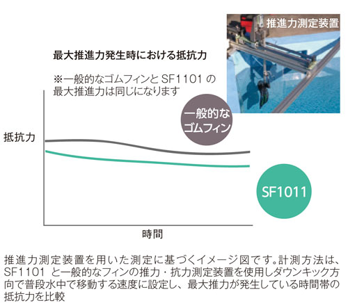 少ない脚力でも一般的なゴムフィンと同じ推進力で泳ぐことができます。