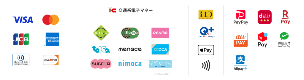 クレジットカード、交通系電子マネー、iD/QuicPay・タッチ決済、QRコード決済など各種取り揃えております